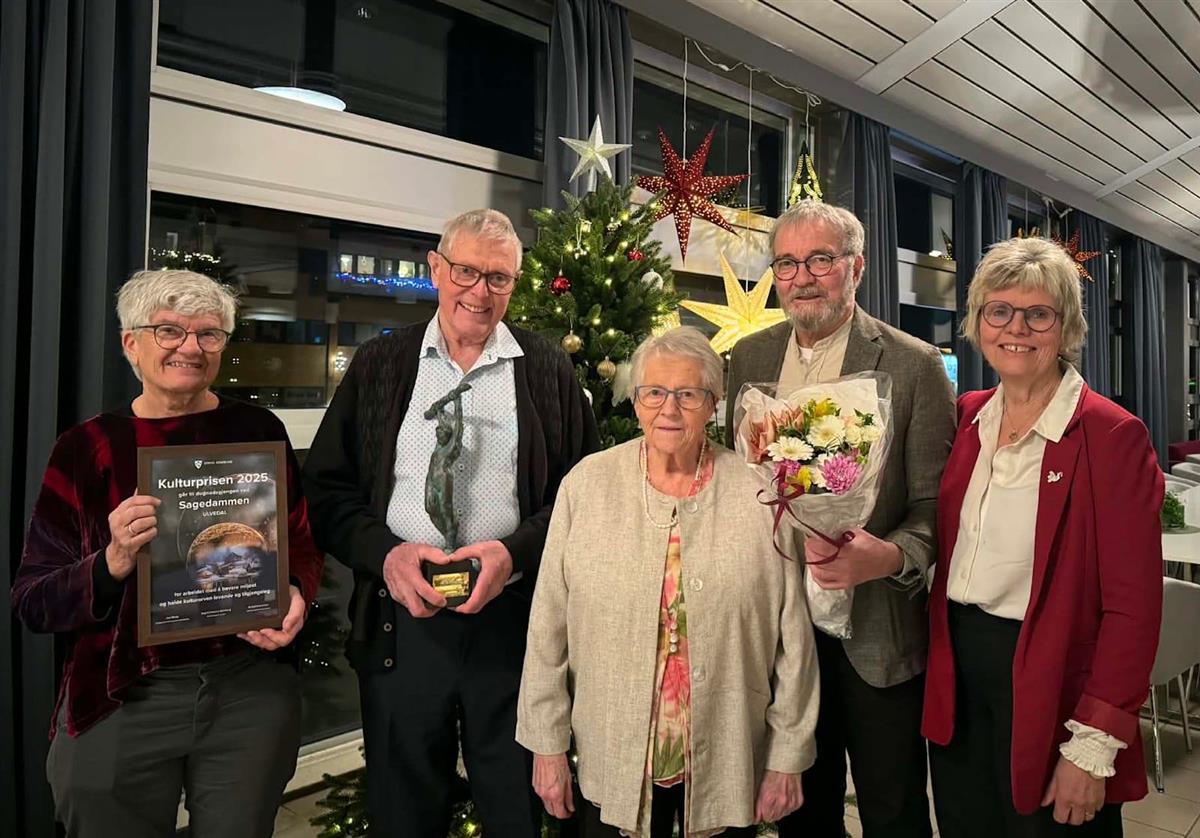 Kulturprisen for 2025 i Stryn kommune gjekk til dugnadsgjengen ved Sagedammen. Her representert ved Anne Stubdal, Hallvard Almenning, Alvhild Almenning, Ottar Ulvedal og Gunnhild Bergset.